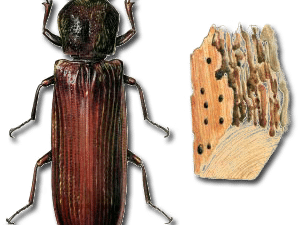 Les trous observés dans des bois infestés correspondent à des émergence par lesquelles les adultes quittent le bois pour retourner dans la nature. Les sciures observées sont des excréments de larves mélangés à du bois non digéré.